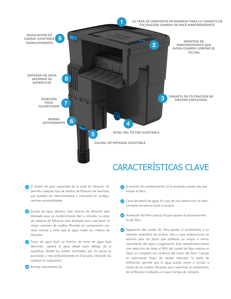 • Canal de desvío de agua: En caso de una obstrucción, el rebosamiento se retorna hacia el acuario.