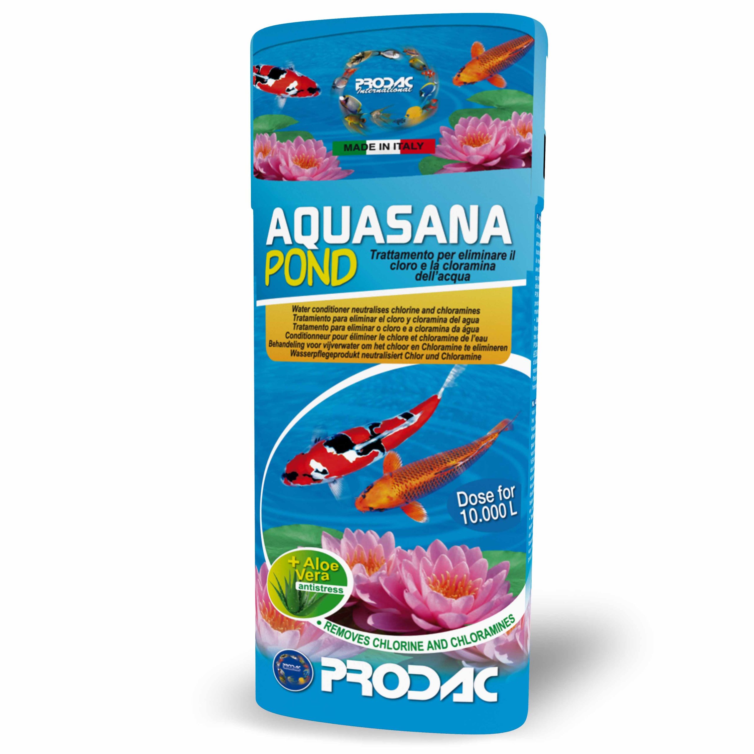 Prodac aquasana pond, tratamiento para el agua del estanque indispensable para eliminar el cloro y cloramina del agua de grifo, anular los efectos de los materiales pesados y preparla para recibir los peces. Contiene ALOE VERA un coloide especial natural que protege la piel de los peces evitando daños a las branquias y a la delicada mucosidad que la recubre. Actúa eficientemente como anti-estrés en los cambios de agua y contribuye en el mantenimiento del pH estable. Envase de 500 ml suficientes para tratar 10.000 l