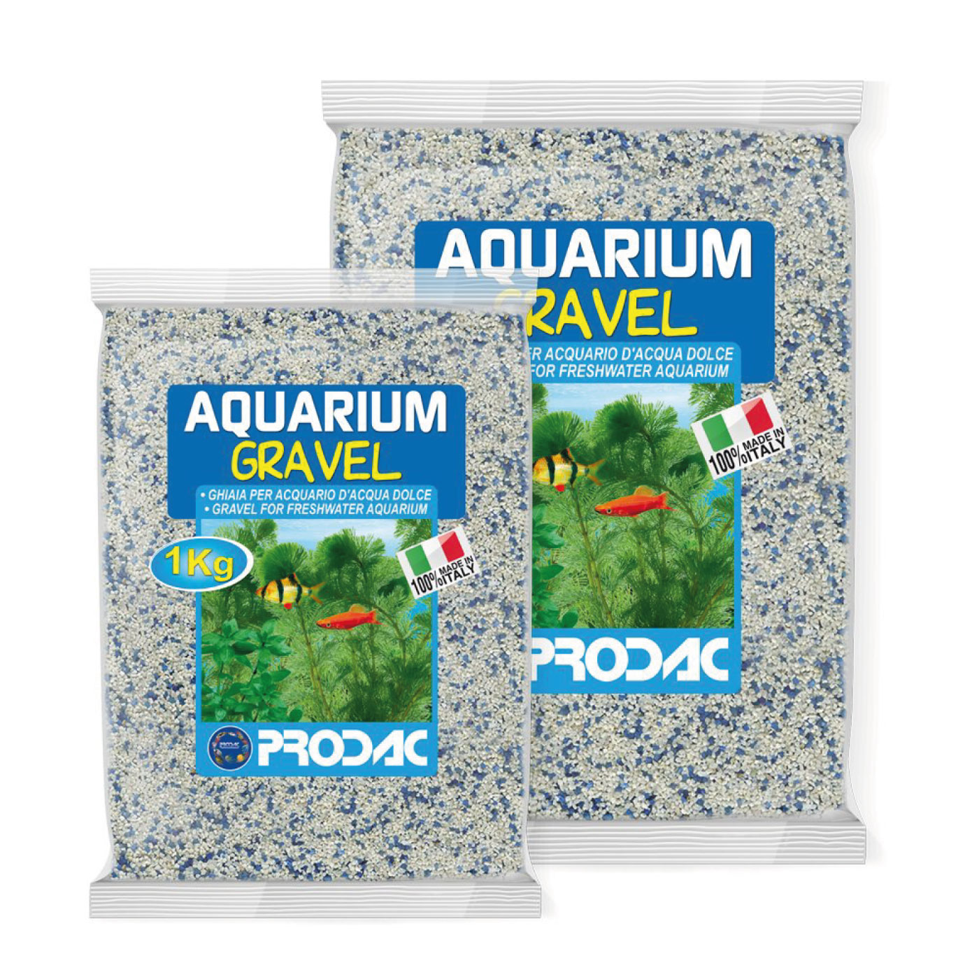 Grava fina decorativa para acuarios mezcla de colores blanco y azul. No altera las propiedades fisico-químicas del agua. Diámetro del grano: 0,7/1,2 mm. Envase de 2,5 kg