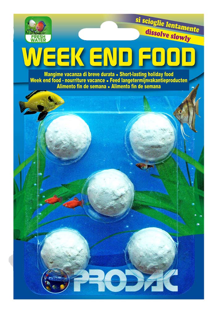 Prodac alimento fin de semana, indicado para introducir en el acuario durante la ausencia prolongada pues se disuelve lentamente alimentando de forma equilibrada toda clase de peces tropicales de agua dulce. Una pastilla es suficiente para un acuario de 100L conteniendo hasta 8 peces de talla media y dura aproximadamente unos 4-5 días. Composición: sulfato de calcio, crustáceos, pescado y sus productos derivados.