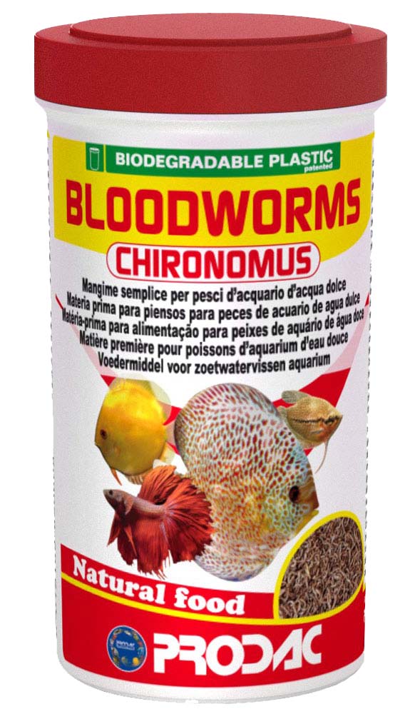 Prodac larva de mosquito, alimento natural compuesto al 100% por larva roja de mosquito liofilizada, indicado para peces que se nutren de insectos. Envase de 100 ml con 7 gr