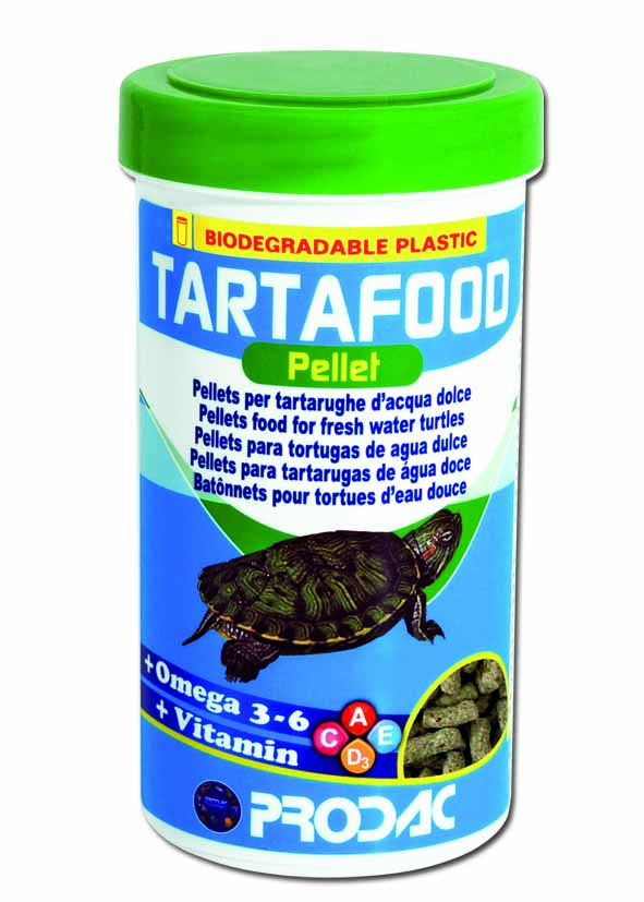 Prodac tartafood pellet, alimento completo en sticks flotantes para tortugas de agua dulce de tamaño entre 7 y 50 cm rico en Calcio (1,8%) Envase de 1200 ml con 350 gr. Empleo: suministrar una o dos veces por día una pizca de alimento en el comedero o directamente en el agua en cantidad de 2,5 gr cada 100 gr de peso de la tortuga. Composición: cereales, pescado y sus productos derivados, hortalizas, hierbas, crustáceos, levaduras. Componentes analíticos: proteína bruta 35,0%, ceniza bruta 7,62%, grasas brutas 5,64%, fibras brutas 2,66%, humedad 6,49%, Omega 6 23,55%, Omega 3 6,05%, calcio 1,8% Aditivos (por kg). Aditivos nutricionales: Vitamina A (3a672a) 15.900 U.I./kg, Vitamina D3 (3a671) 1.980 U.I./kg, Vitamin C (3a312) 142 mg/kg, Vitamina E (3a700) 127 mg/kg. Colorantes.